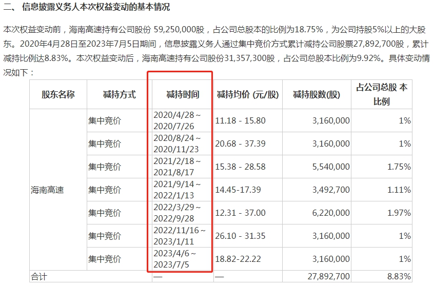 海南高速持续减持来源:海汽集团公告