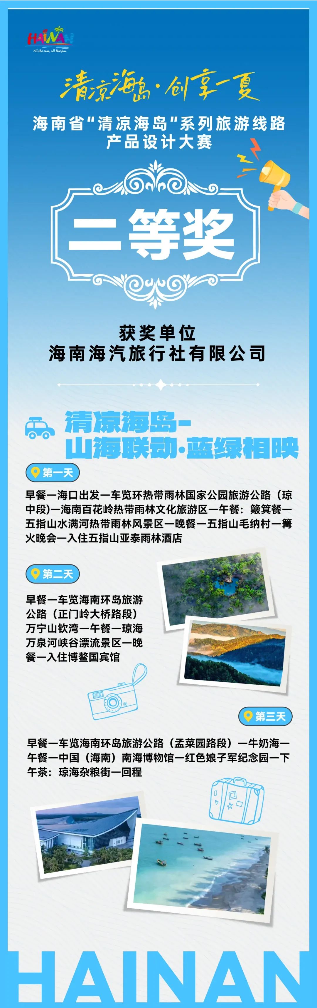 高新技术资质赋能,文旅融合不断创新。旗下海南金运科技公司成功获得高新技术企业认定、ISO三体系认证及“AAA级信用企业”证书,软件开发与系统集成能力得到权威认可,为海汽集团数字化转型提供坚实技术保障。旗下海汽旅行社凭借精心设计的“山海联动·蓝绿相映”主题线路,在海南省“清凉海岛”旅游线路设计大赛中荣获二等奖,充分展现了海汽的创新实力与专业素养,彰显文旅业务协同发展新成效。