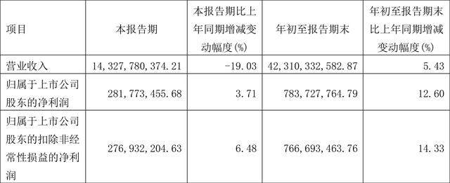 根据三季报,公司第三季度实现营业收入143.28亿元,同比下降19.03%,环比下降7.52%;归母净利润2.82亿元,同比增长3.71%,环比增长8.27%;扣非净利润2.77亿元,同比增长6.48%,环比增长9.89%。