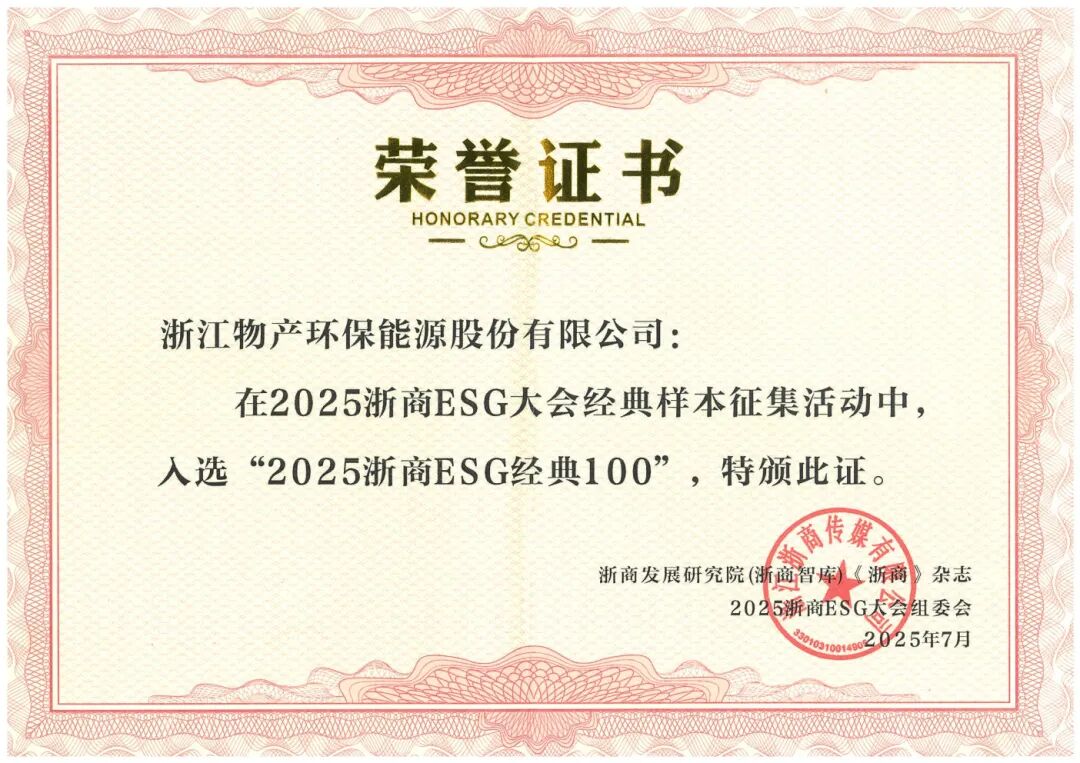 近日, 物产环能 在可持续发展领域接连获得三项重要荣誉:入选 中国上市公司协会 “2025年ESG可持续发展优秀实践案例”,获评 浙江省工业经济联合会 “2025年浙江省企业社会责任报告优秀案例”,并成功跻身浙商发展研究院(浙商智库)《浙商杂志》“2025浙商ESG经典100”榜单。三项荣誉的集中落地,既体现了公司在推动生态文明建设、社会责任践行和治理体系完善方面的综合实力,也反映了资本市场对公司高质量发展成效的广泛认同。