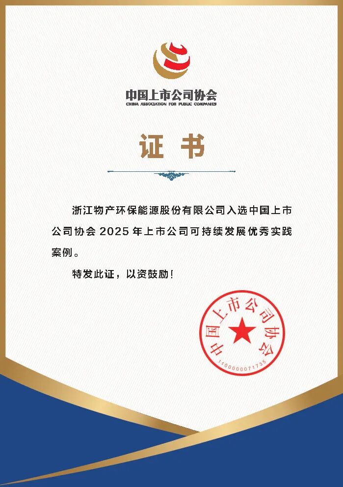 公司凭借在资源循环利用与可持续发展方面的实践,入选 中国上市公司协会 “2025年ESG可持续发展优秀实践案例”。该评选涵盖环境、社会、治理等多个维度,旨在推动上市公司高质量发展和可持续生态体系建设。本次共有319家公司获选,占A股上市公司总数的5.9%。