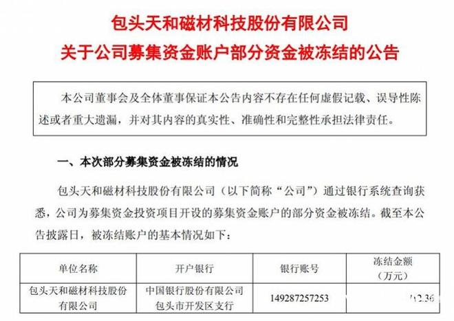 2025年10月20日,天和磁材公告称,公司为募集资金投资项目开设的资金账户部分资金被冻结,冻结资金712.36万元。