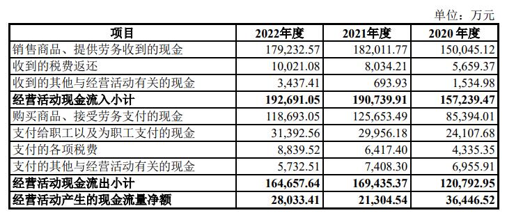 2020年、2021年、2022年,热威股份销售商品、提供劳务收到的现金分别为150,045.12万元、182,011.77万元、179,232.57万元;经营活动产生的现金流量净额分别为36,446.52万元、21,304.54万元、28,033.41万元。