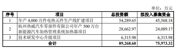 热威股份最终募集资金净额比原计划多4589.38万元。2023年9月5日,热威股份发布的首次公开发行股票并在主板上市招股说明书显示,公司拟募集资金75,973.32万元,用于年产4,000万件电热元件生产线扩建项目、杭州热威汽车零部件有限公司年产500万台新能源汽车加热管理系统加热器项目、技术研发中心升级项目。