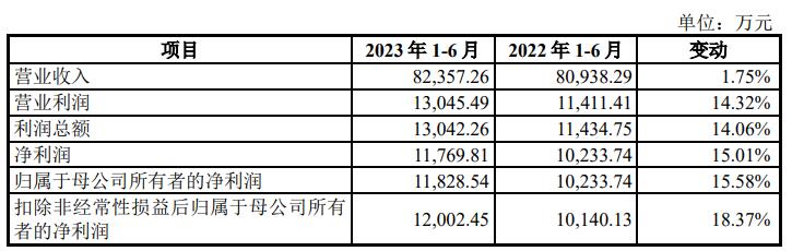 2023年1-6月,热威股份营业收入82,357.26万元,同比增长1.75%;净利润11,769.81万元,同比增长15.01%;归属于母公司所有者的净利润11,828.54万元,同比增长15.58%;扣除非经常性损益后归属于母公司所有者的净利润12,002.45万元,同比增长18.37%;经营活动产生的现金流量净额13,675.12万元,上年同期2,909.74万元。