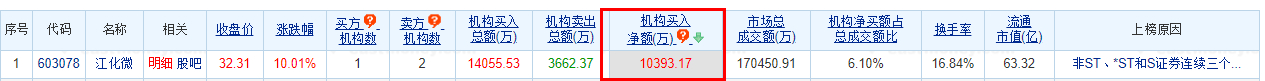 龙虎榜数据显示,买入江化微金额最大的前五名中,有1家机构专用席位;卖出江化微金额最大的前五名中,有2家机构专用席位。经统计,今日江化微的机构席位净买入金额为10393.17万元。