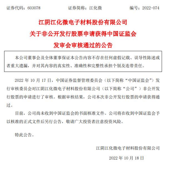 10月18日,江阴江化微电子材料股份有限公司(简称“江化微”,603078.SH)昨日发布关于非公开发行股票申请获得中国证监会发行审核委员会审核通过的公告。2022年10月17日,中国证券监督管理委员会(简称“中国证监会”)发行审核委员会对江化微非公开发行股票的申请进行了审核。根据审核结果,公司本次非公开发行股票的申请获得通过。