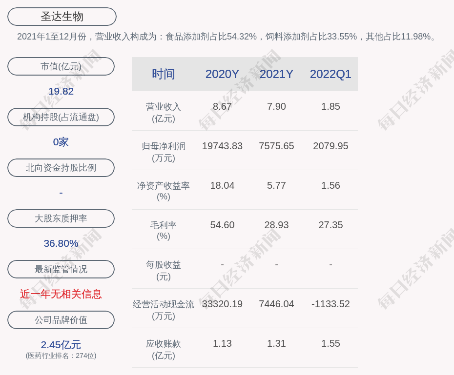 2021年1至12月份,圣达生物的营业收入构成为:食品添加剂占比54.32%,饲料添加剂占比33.55%,其他占比11.98%。