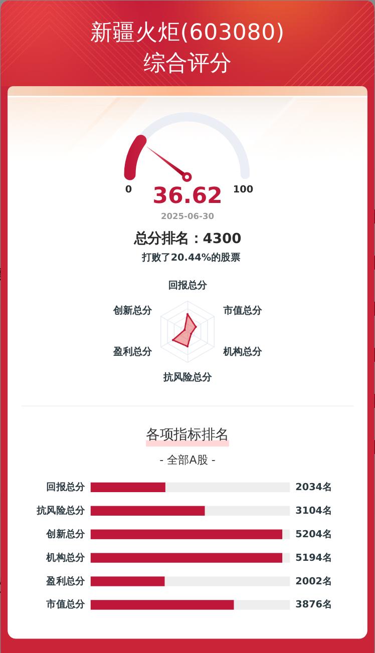 上市公司研究院构建了一套上市公司韧性评价体系,从企业盈利、科技创新、股东回报、经营抗风险、市值表现及机构吸引力六个维度对企业进行量化评分,满分为100分。新疆火炬的韧性评价总分为36.62分,在A股5405家可比上市公司中排名第4300位。