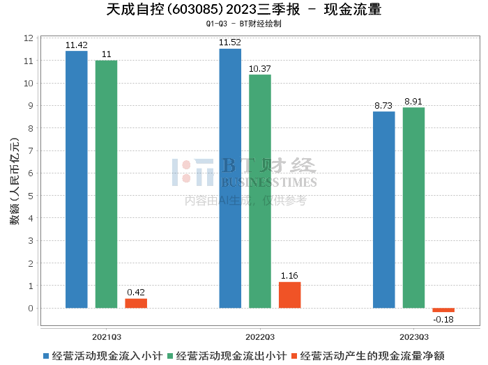 在资产负债方面,根据2023年三季报,天成自控的总资产从上年度末的23.85亿元增长到24.26亿元,微增1.71%。负债合计也有所上升,从14.72亿元增至15.25亿元。净资产略有下降,从9.13亿元减少到9.01亿元,减少1.32%。资产负债率从61.72%上升至62.86%,显示公司负债水平略有上升。商誉方面,报告期末为1856.72万元,较上年度末的1816.4万元略有增长。
