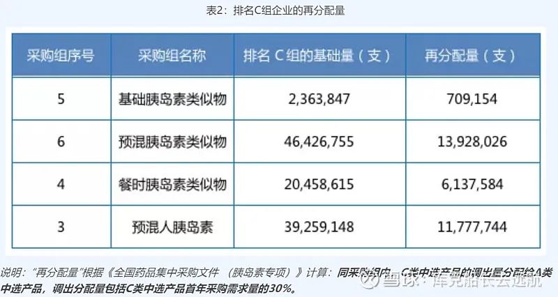 本次集采甘李药业在基本确保获得表1中基础量之上,还有资格分得来自C组企业的再分配量(如表2所示)共计3250余万支的部分,进一步获得增量,大幅提升甘李的市场数量占比,并抵消一部分价格下降带来的收入影响。