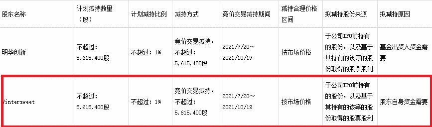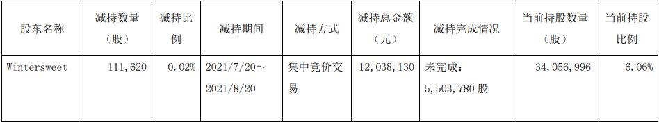 甘李药业于2021年6月29日发布的《股东集中竞价减持股份计划公告》显示,截至公告披露日,Vast Wintersweet Limited(以下简称“Wintersweet”)持有公司3416.86万股,占公司总股本的6.08%;自公告发布之日起满15个交易日后的3个月内,Wintersweet拟通过集中竞价交易方式合计减持数量不超过561.54万股,即不超过公司总股本的1%。