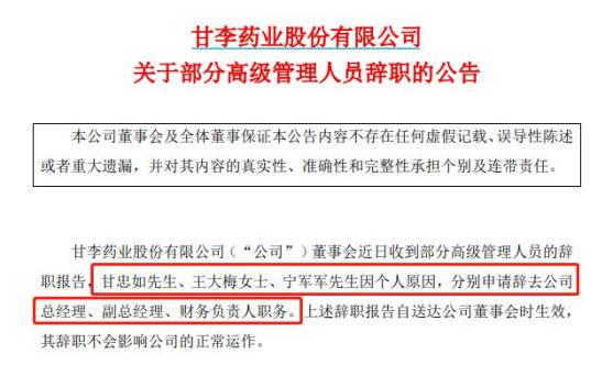 2020年06月29日顺利上市了,在上市不足一个月的时间里便迎来了高层大洗牌。2020年7月21日,甘李药业公告称,甘李药业的总经理甘忠如、副总经理王大梅和财务负责人宁军军同时辞去职务,甘忠如仍担任公司董事长。