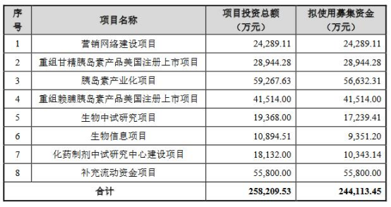 甘李药业2020年6月15日发布的招股说明书显示,公司拟募集资金244,113.45万元,分别用于“营销网络建设项目”、“重组甘精胰岛素产品美国注册上市项目”、“胰岛素产业化项目”、“重组赖脯胰岛素产品美国注册上市项目”、“生物中试研究项目”、“生物信息项目”、“化药制剂中试研究中心建设项目”及补充流动资金项目。