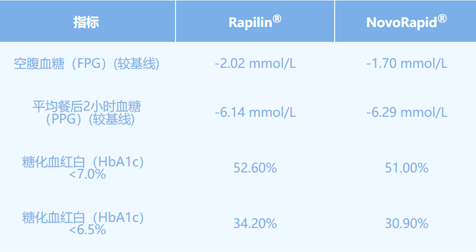 1.590名2型糖尿病患者被随机分配到Rapilin?(n = 441)和NovoRapid?(n = 149)组。连续给药24周后,HbA1c相较基线的平均变化分别为-2.20%(Rapilin?)和-2.32%(NovoRapid?);基于最小二乘均值的估计治疗差异为0.04%(95% Confidence Interval, CI:-0.17, 0.26),符合Rapilin?与NovoRapid?的非劣效性标准。
