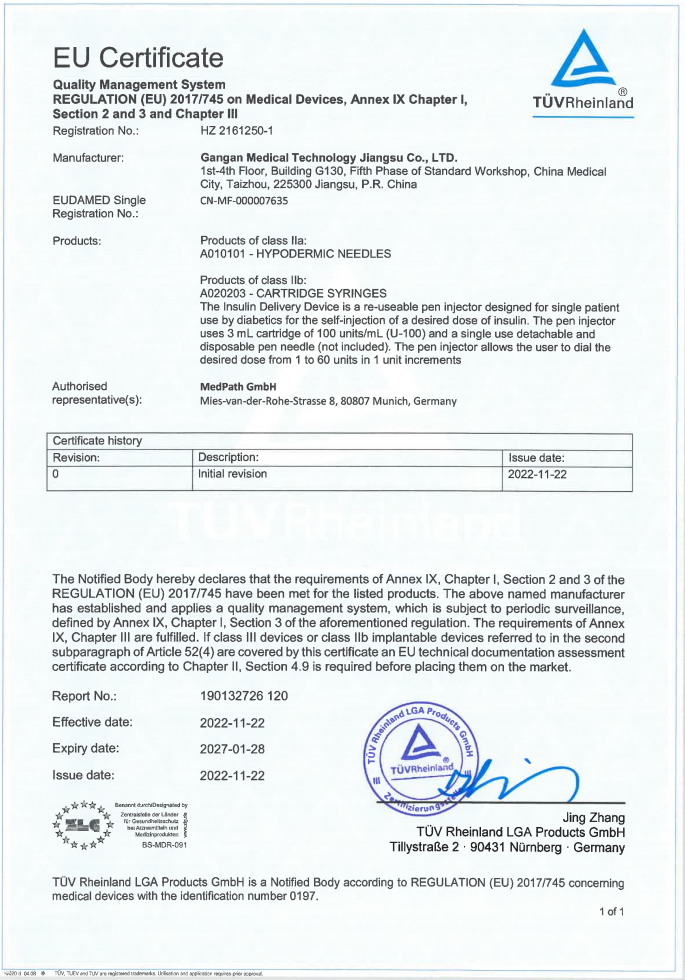 2022年11月22日,国际独立第三方检测、检验和认证机构德国莱茵TUV集团(公号机构号0197,以下简称:TUV莱茵)向甘甘医疗生产的笔式胰岛素注射器和一次性注射笔用针头签发了基于欧盟医疗器械法规(REGULATION (EU) 2017/745,简称:MDR)的公告机构CE符合性证书。在此之前,甘甘医疗已获得由TUV莱茵颁发的EN ISO 13485以及MDSAP 2016(美国、加拿大)的质量管理体系认证证书。