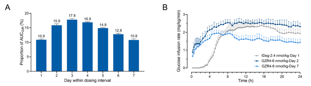 (A)基于PopPD模型预测的GZR4(6 nmol/kg)在稳态条件下一周内的每日降糖效果的分布情况;(B)健康受试者单次皮下注射6 nmol/kg GZR4后24-48小时(第2天)和144-168小时(第7天),或单次皮下注射2.4 nmol/kg德谷胰岛素后0-24小时(第1天)的葡萄糖输注率-时间曲线。IDeg,德谷胰岛素