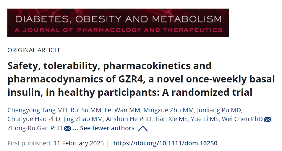 近日,甘李药业在研1类新药胰岛素周制剂GZR4注射液在中国完成的一项Ia期临床研究成果在国际权威学术期刊《Diabetes, Obesity and Metabolism》上成功发表。作为一份全球性的内分泌代谢领域权威学术期刊,其2024年最新影响因子为5.8,中科院分区二区,在业界具有广泛的影响力。文章表明,GZR4注射液在健康受试者中展现出良好的安全性和耐受性,其药代动力学与药效动力学特征支持其作为每周一次给药的基础胰岛素;在等摩尔浓度下,每周一次给药的GZR4注射液在降糖效果方面优于每日一次给药的德谷胰岛素1。