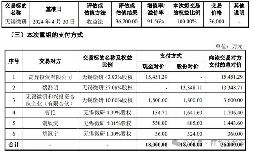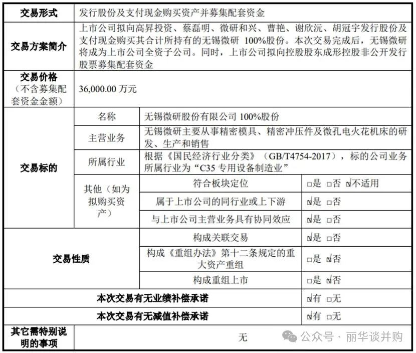 本次交易由发行股份及支付现金购买资产和募集配套资金两部分组成。上市公司拟以发行股份及支付现金的方式向交易对方购买其所持有的无锡微研100%股权,交易价格为36,000.00万元,以股份和现金支付交易对价的比例均为50%。