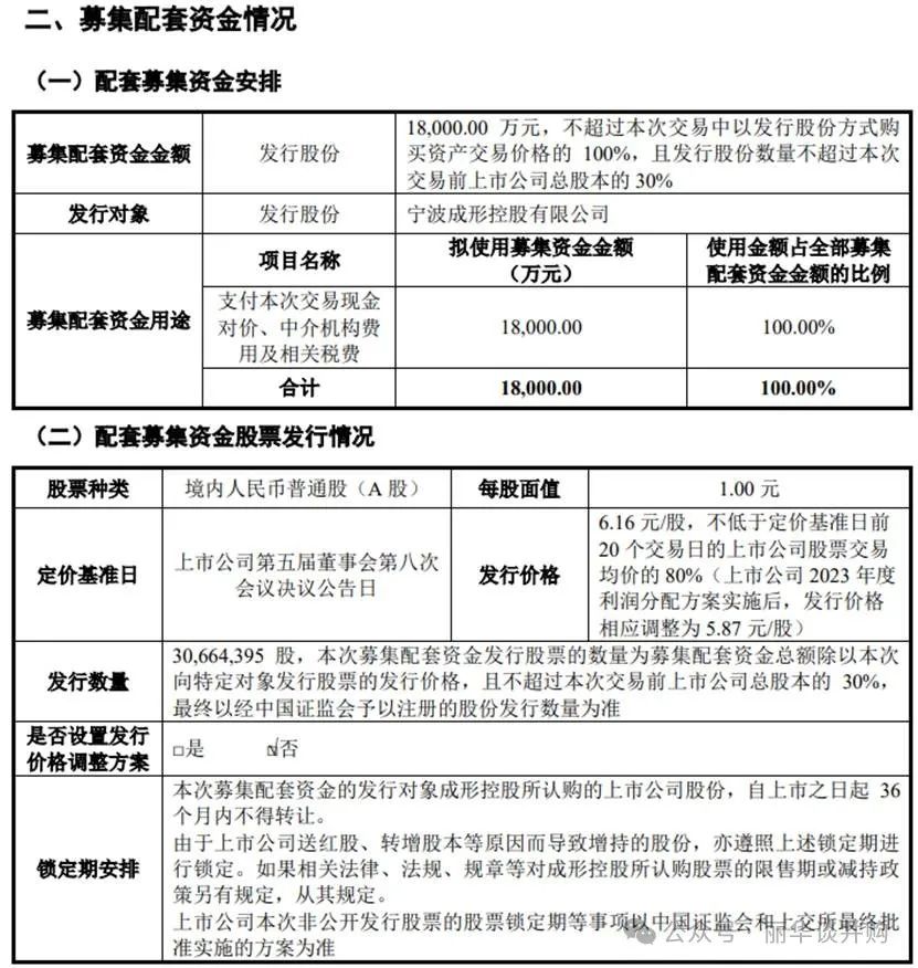 同时,上市公司拟向控股股东成形控股发行股份募集配套资金,配套资金总额为18,000.00万元,不超过本次交易中以发行股份方式购买资产交易价格的100%,且发行股份数量不超过本次交易前上市公司总股本的30%。