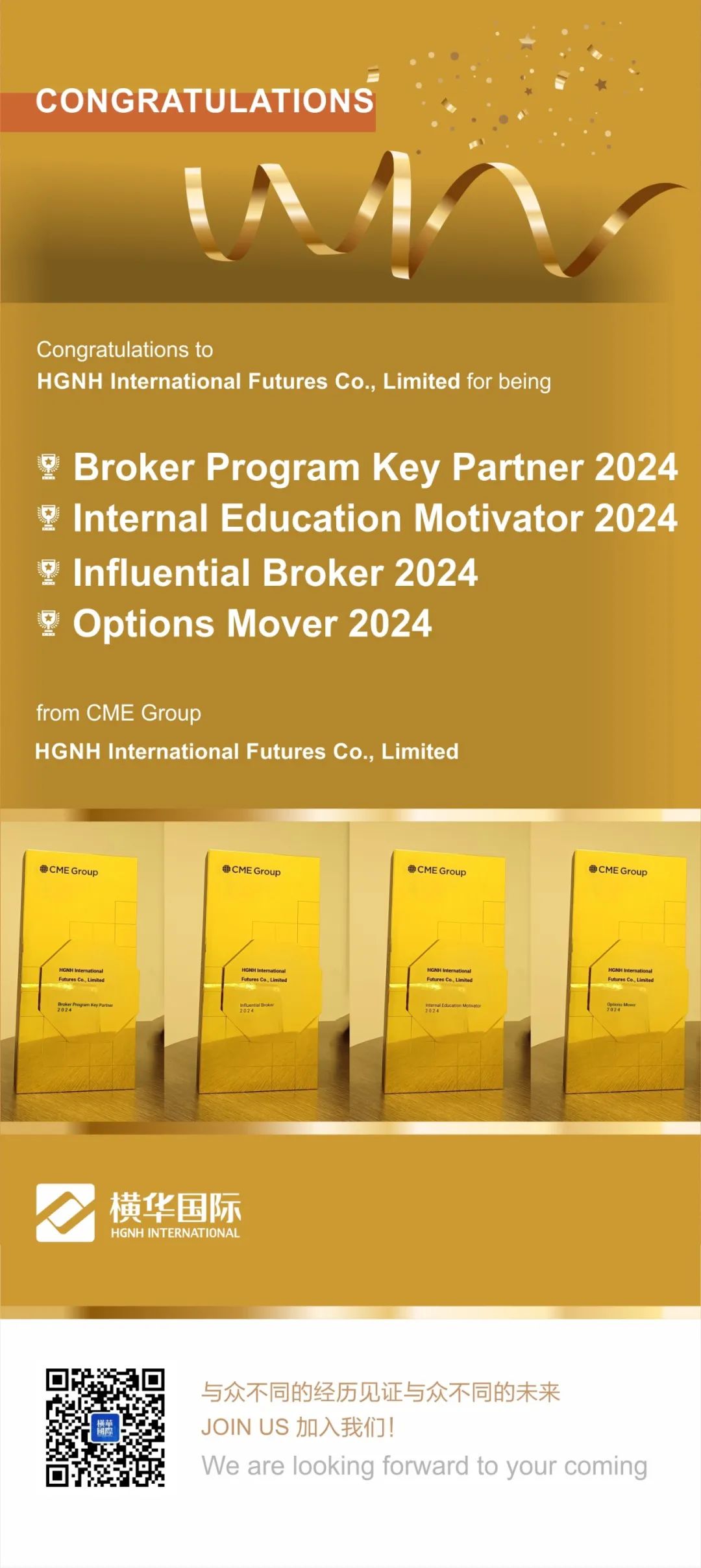 近日,南华期货旗下的横华国际期货有限公司(以下简称横华期货)在由CME Group(下称芝商所)颁发的「最关键合作经纪商 Broker Program Key Partner 2024」、「最有影响力经纪商 Influential Broker 2024」、「内部教育激励者 Internal Education Motivator 2024」及「期权活跃交易商 Options mover 2024」四个奖项。