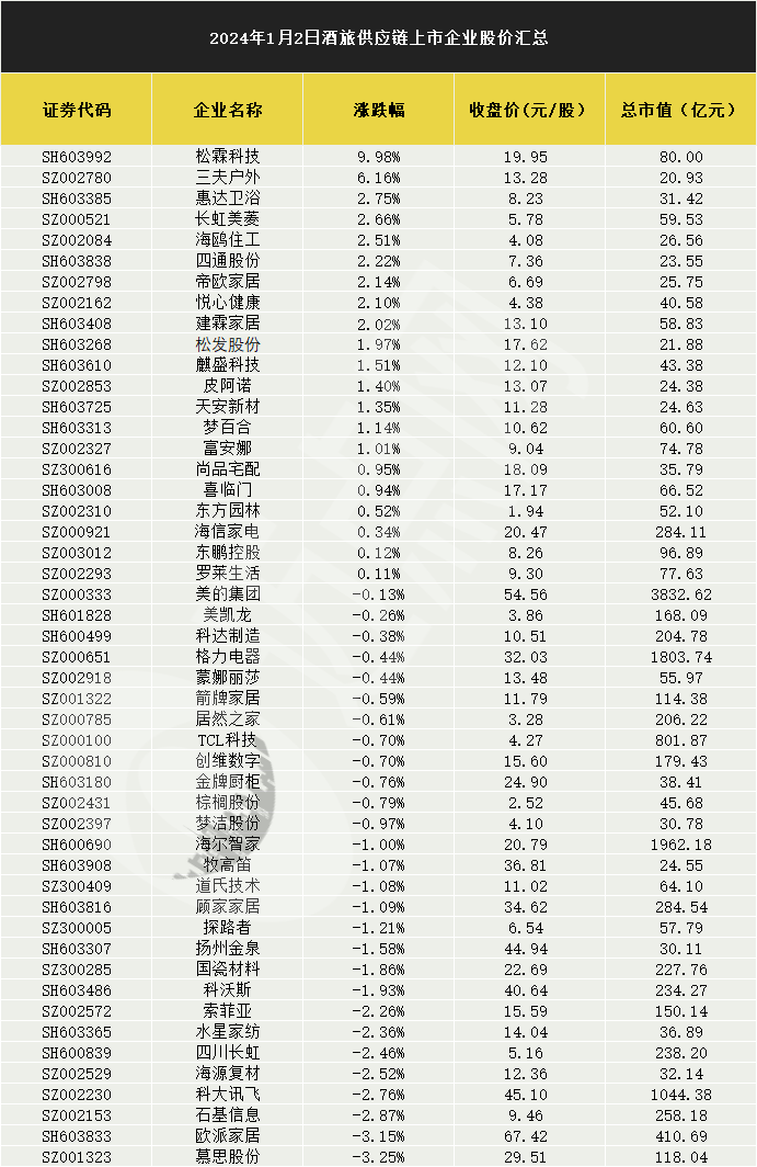 酒旅供应链个股方面,松霖科技(SH:603992)午后强势涨停,三夫户外(SZ:002780)涨超6%,惠达卫浴(SH:603385)、长虹美菱(SZ:000521)、海鸥住工(SZ:002084)等涨超2%。