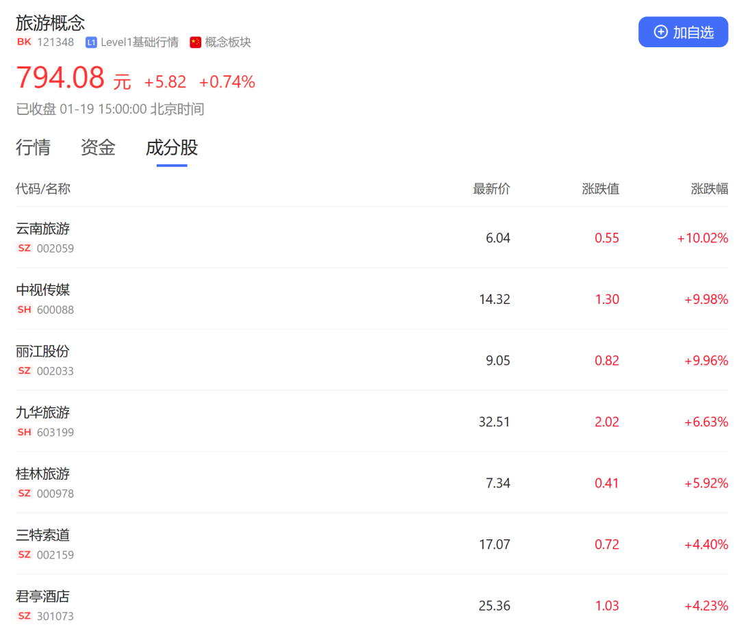 除长白山外,1月19日,A股旅游板块异动拉升,丽江旅游涨停,九华旅游、云南旅游等个股跟涨。