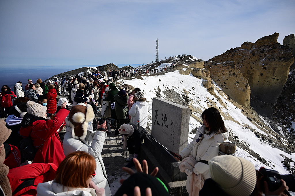 2023年2月9日,吉林延边,长白山美如画,吸引众多游客观光。视觉中国资料图