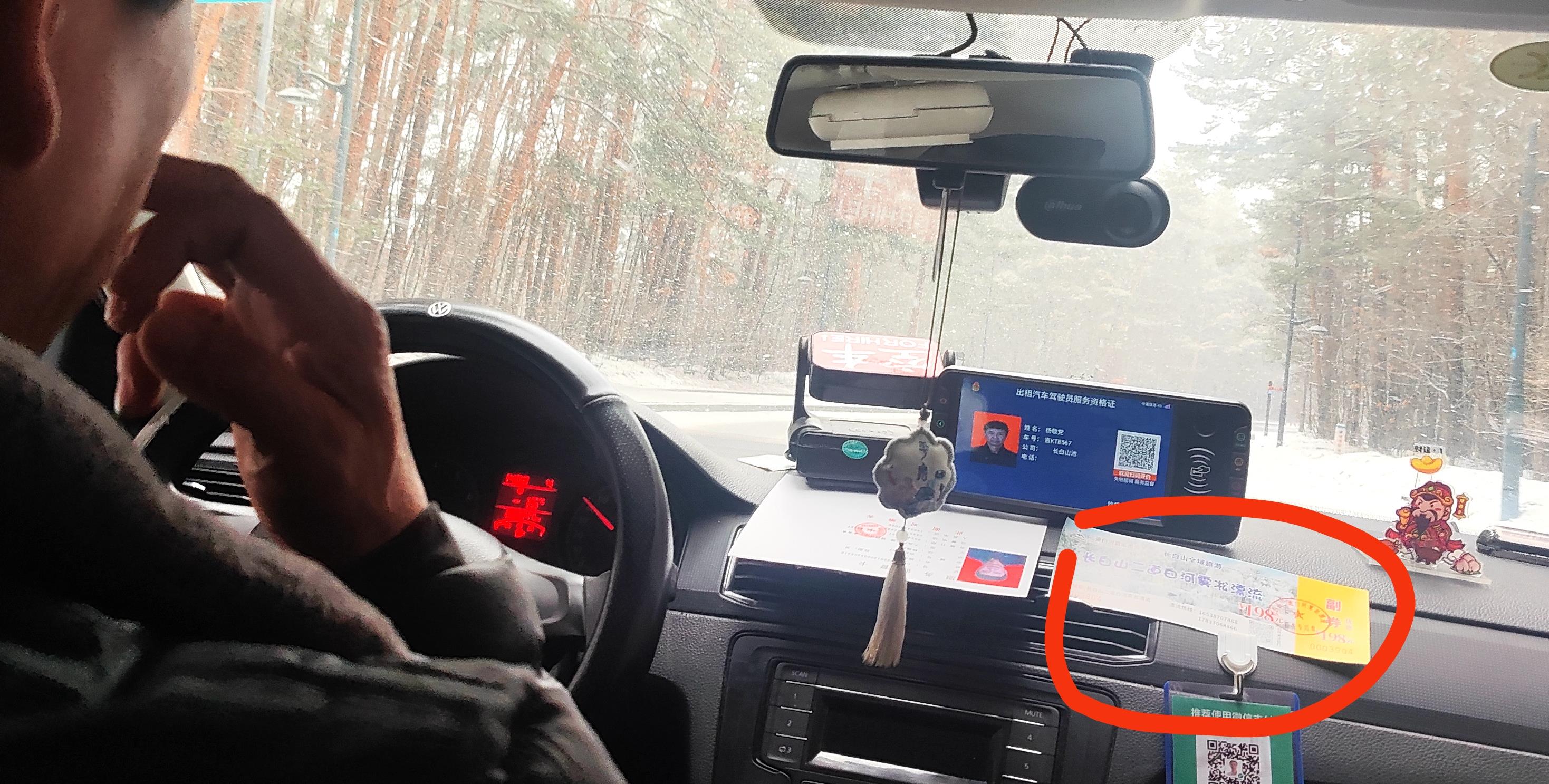 出租车副驾驶台上放着待售的长白山二道白河雾凇漂流景区的门票。
