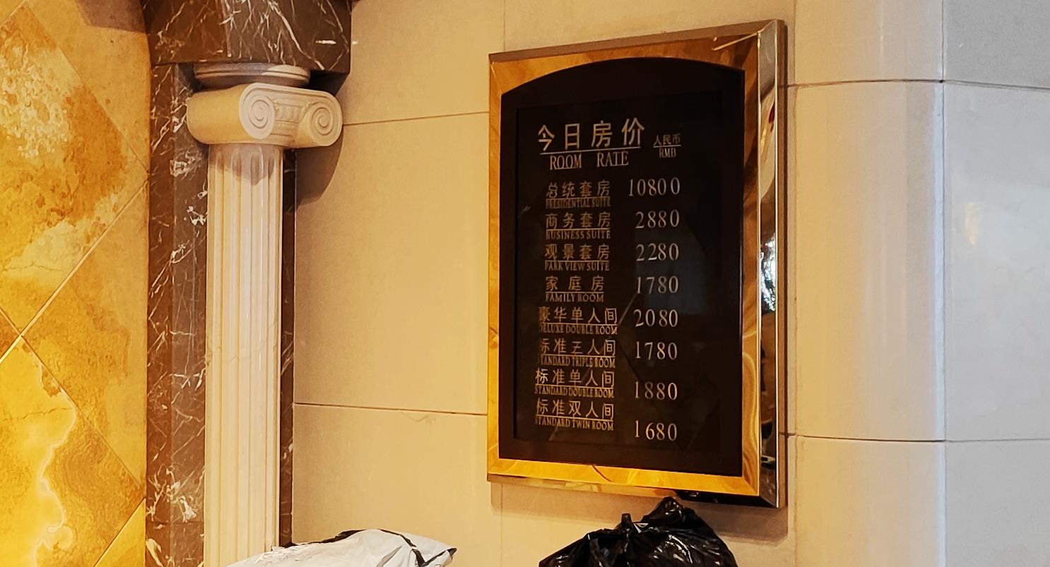 长白山金水鹤国际酒店前台告示栏中虚标的“今日房价”。