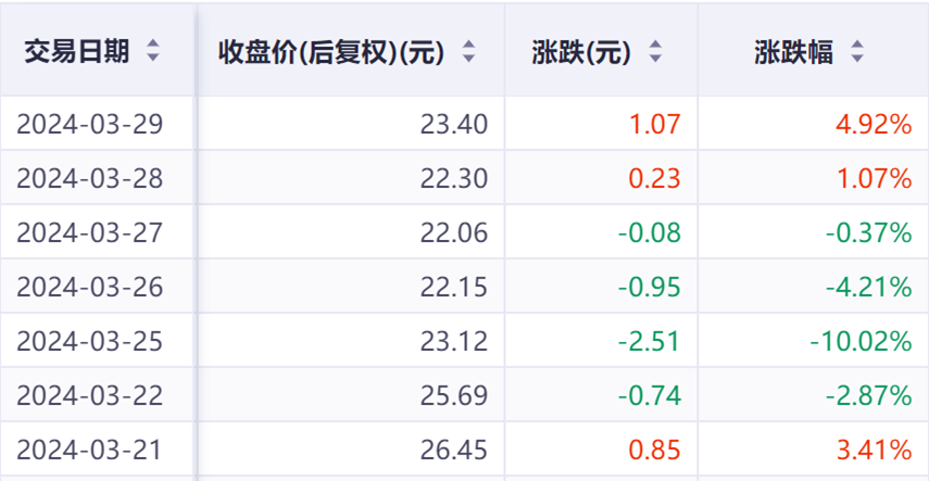 3月26日,收盘价22.15,继续下跌,跌幅为4.21%