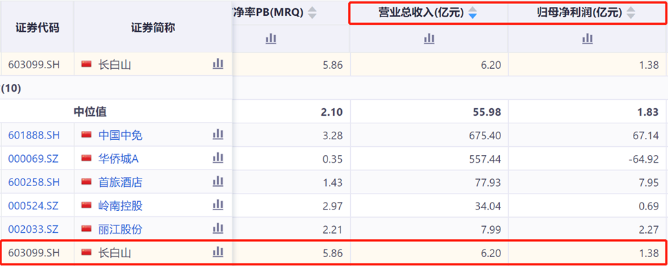 具体来看,长白山营收规模6.2亿元,排名垫底,低于中国中免、华侨城A、首旅酒店、岭南控股、丽江股份等已披露年报数据的企业。