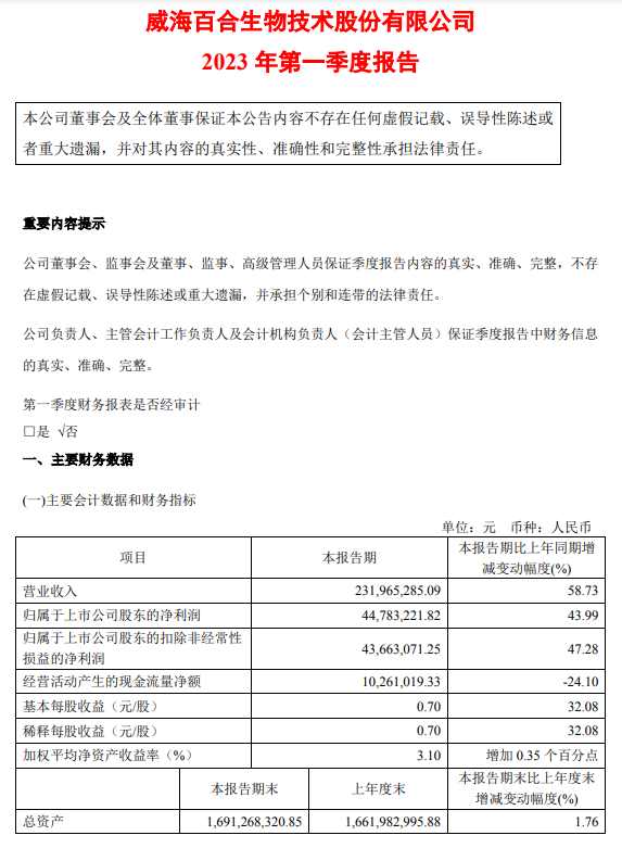 百合股份(603102)4月6日晚间披露2023年两市首份一季报,一季度实现营业收入2.32亿元,同比增长58.73%;净利润4478万元,同比增长43.99%。同日公告,公司2022年实现营业收入7.25亿元,同比增长9.59%;净利润1.38亿元,同比下降6.89%;基本每股收益2.2元;拟每10股派发红利6元(含税)。
