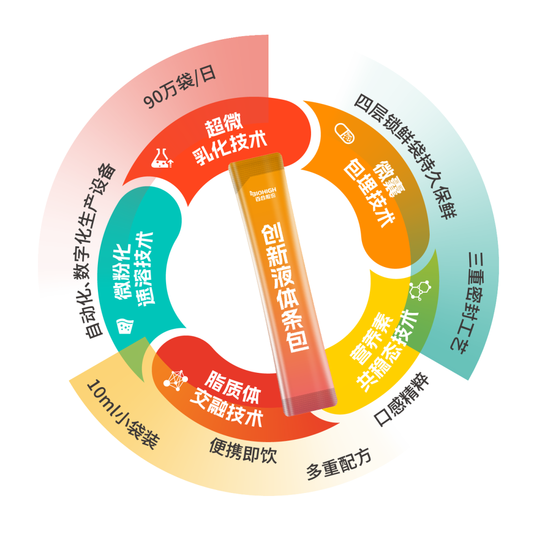 百合股份研发中心目前已积累100+专利,5000+营养保健食品配方,通过持续的技术创新,开启精准锁鲜新纪元,解码婴童营养液体剂型新可能。围绕营养成分的摄入和吸收流程,百合股份利用超微乳化技术、微囊包埋技术、营养素共稳态技术、脂质体交融技术、微粉化速溶技术等硬核技术,实现多重营养素与液体条袋饮创新性结合,更高效、更精准、更可持续的营养吸收和转化。采用三重密封工艺,四层锁鲜袋持久保鲜,定量灌装,10ml小袋装,精度达±1%。