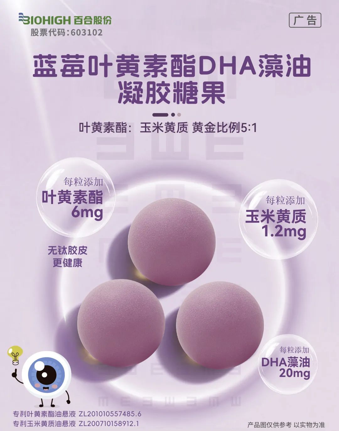 百合股份的叶黄素酯爆浆凝胶糖果,选用了5种营养成分复配,包括叶黄素酯、玉米黄质、DHA藻油、蓝莓浓缩粉、锌,其中叶黄素酯和玉米黄质还具有专利技术;口感上综合调配,营造出了酸甜果味。该产品获得了“2024营养智造技术跃迁突破奖”。