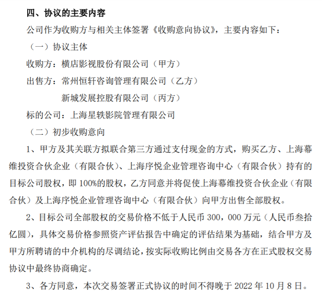横店影视公告显示,公司拟通过支付现金的方式,购买星轶影院100%的股权,全部股权的交易价格不低于人民币30亿元,本次交易签署正式协议的时间不得晚于2022年10月8日。
