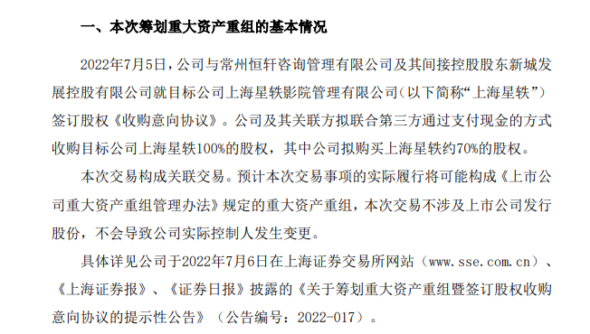 三个月前,横店影视曾表示将通过支付现金的方式收购上海星轶影院管理有限公司(以下简称“上海星轶”)股权。上海星轶全部股权的交易价格不低于30亿元。