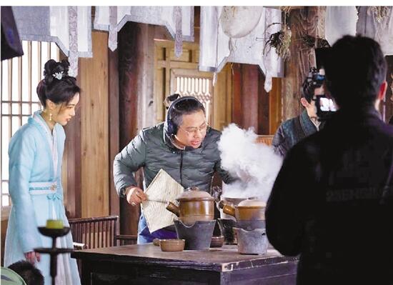 今年1月,孔厉大(左二)在拍摄现场与演员交流。共享联盟·横店单冠定摄