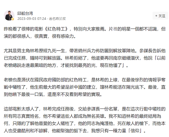 影片最后,为递出情报牺牲的一众红色特工们的真实姓名再次回响在屏幕上,故事张力和情感浓度达到最大值。这是内容策划巧思的映照。