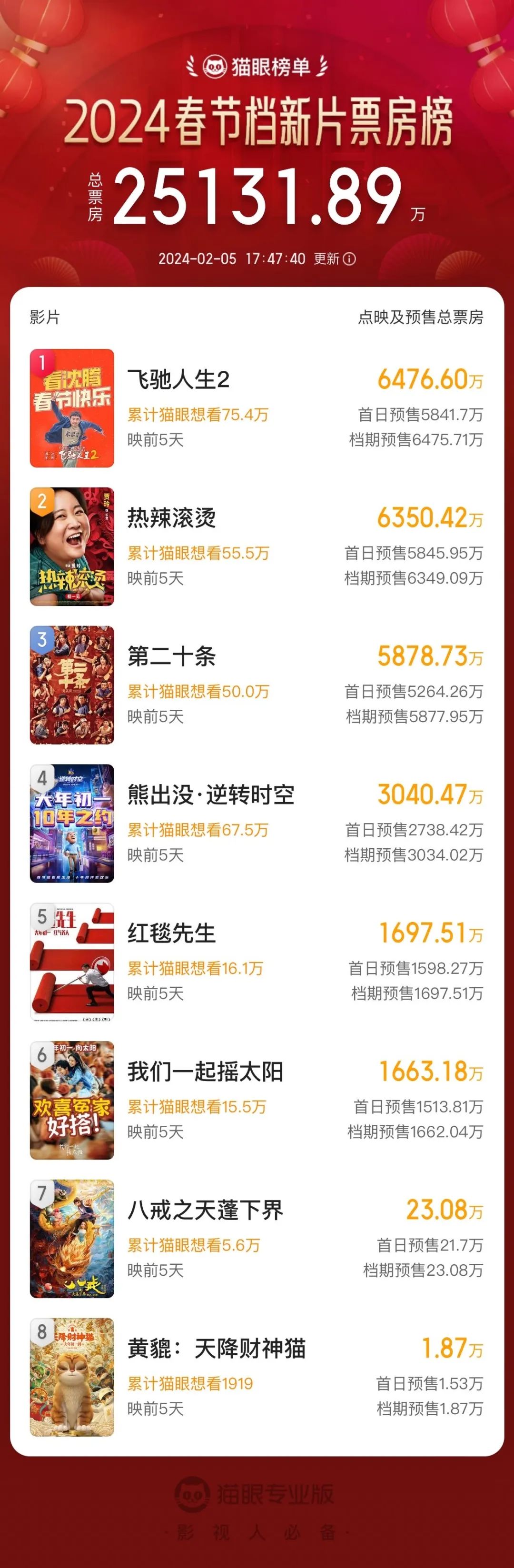 距离龙年春节还有5天时间,目前春节档预售总票房已突破了2.5亿元。其中,由横店影视旗下浙江横店影业有限公司联合出品的电影《飞驰人生2》暂领先,位列春节档票房预售榜、想看榜双第一!