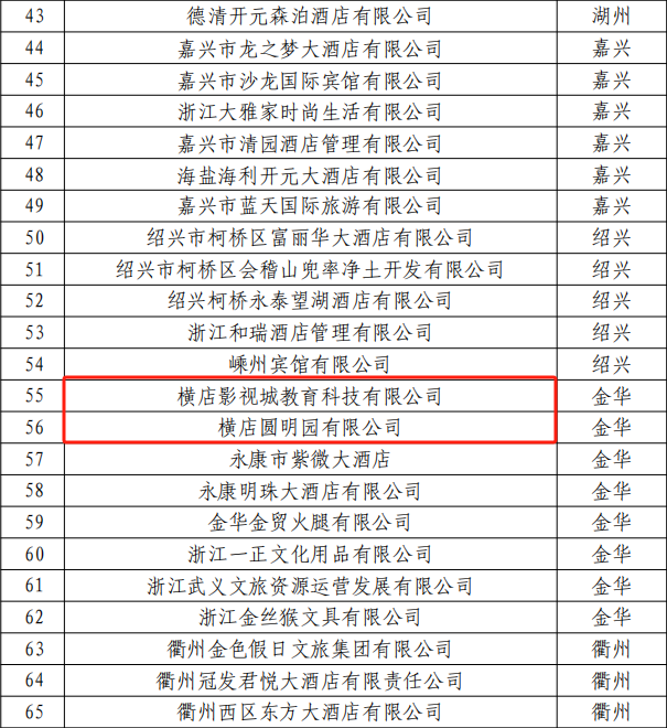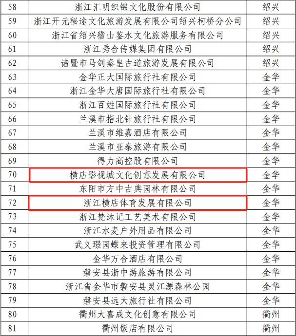 横店影视股份有限公司、横店影视剧组服务有限公司入选第三批浙江省文化和旅游企业梯度培育计划领军型企业、横店影视城教育科技有限公司、浙江横店圆明新园有限公司为第三批浙江省文化和旅游企业梯度培育计划骨干型企业、横店影视城文化创意发展有限公司、浙江横店体育发展有限公司为第三批浙江省文化和旅游企业梯度培育计划新锐型企业。(文末附文件截图)