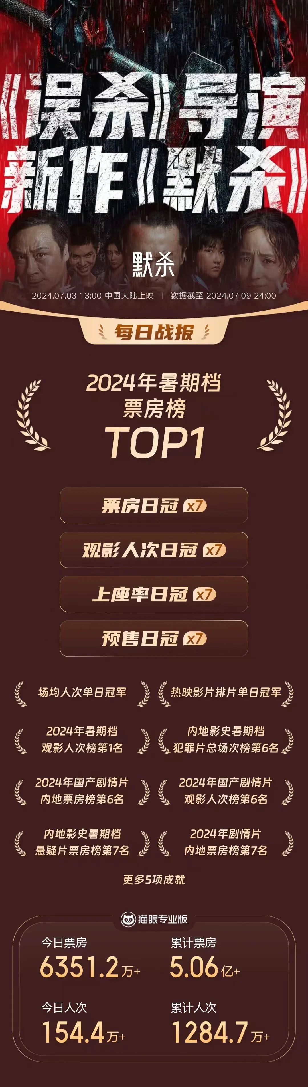 截至7月10日,电影《默杀》累计总票房超5.33亿,不仅暂列暑期档票房冠军,预测还将成为春节档以后,首部破10亿+票房的电影,目前《默杀》已超越《维和防暴队》杀进2024年新片电影票房榜前十!