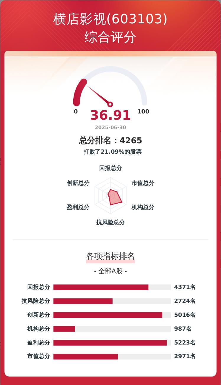 金融界上市公司研究院构建了一套上市公司韧性评价体系,从企业盈利、科技创新、股东回报、经营抗风险、市值表现及机构吸引力六个维度对企业进行量化评分,满分为100分。横店影视的韧性评价总分为36.91分,在A股5405家可比上市公司中排名第4265位。