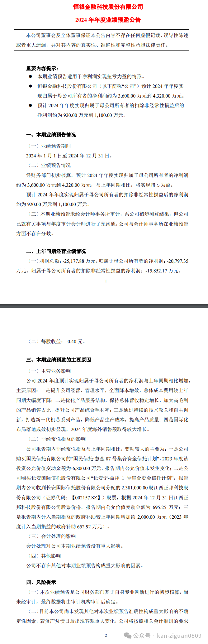2、恒银金融科技股份有限公司(以下简称“公司”)预计2024年年度实现归属于母公司所有者的净利润约为3,600.00万元到4,320.00万元。