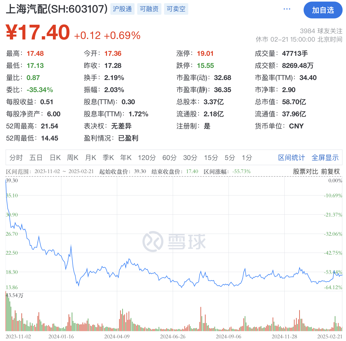 二级市场上,上海汽配上市首日股价大涨,此后一路下跌。最新股价报17.40元/股,总市值58.70亿元。对此,有股民不解,“跌成这样都能减持?”