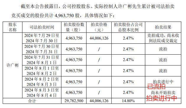 从今年7月至8月,许广彬持有的2978万股股票分六次进行司法拍卖,约占总股本的14.8%。不过,其中四场拍卖均因无人出价流拍,竞买成交的股票仅496万股。