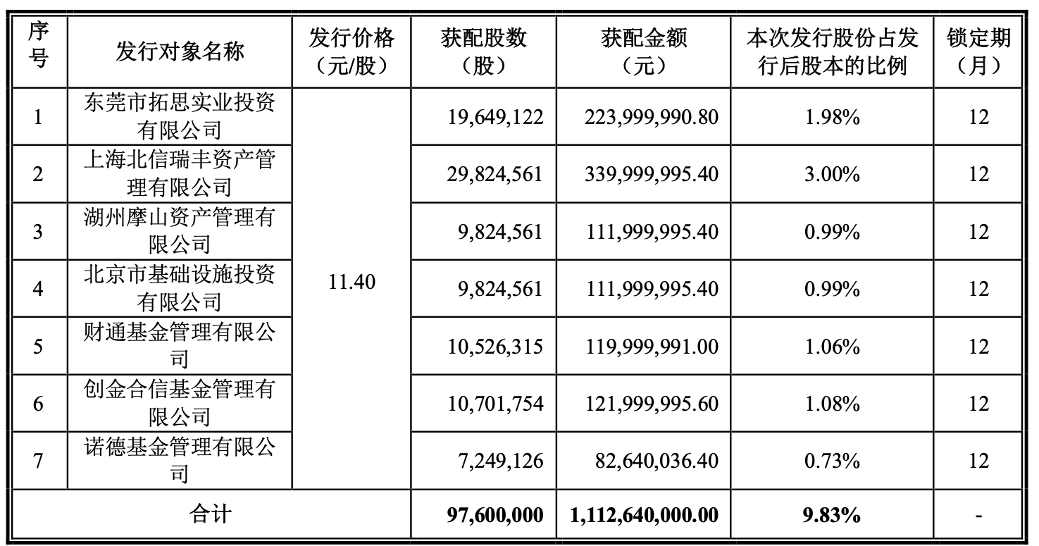 记者了解到,2018年2月28日,康尼机电共增发9760万股,分别向东莞市拓思实业投资有限公司、上海北信瑞丰资产管理有限公司、湖州摩山资产管理有限公司、北京市基础设施投资有限公司、财通基金、创金合信基金、诺德基金等7家特定投资者进行非公开发行。