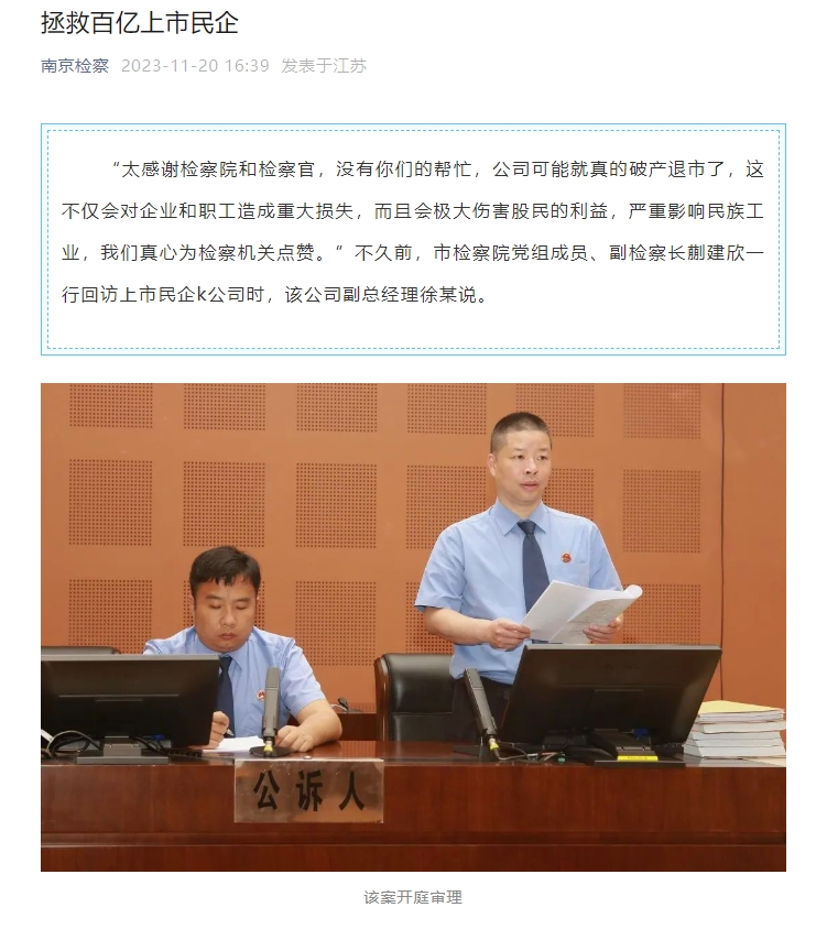 11月20日,南京市人民检察院在其微信公众号“南京检察”上以“拯救百亿上市民企”为题,披露了一起案件。