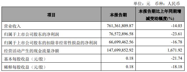 华翔股份2023年第一季度报告显示,2023年一季度,华翔股份实现营业收入7.61亿元,同比下滑14.03%;归属于上市公司股东的净利润7657.29万元,同比下滑23.61%;归属于上市公司股东的扣除非经常性损益的净利润6669.95万元,同比下滑16.78%;经营活动产生的现金流量净额1.48亿元,同比增长1671.92%。