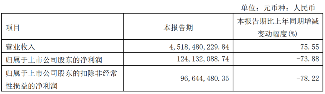 4月25日晚,金能科技发布2022年第一季度报告,报告期内,公司营业收入为45.2亿元,同比增长75.55%;归属于上市公司股东的净利润为1.24亿元,同比大幅下滑73.88%。